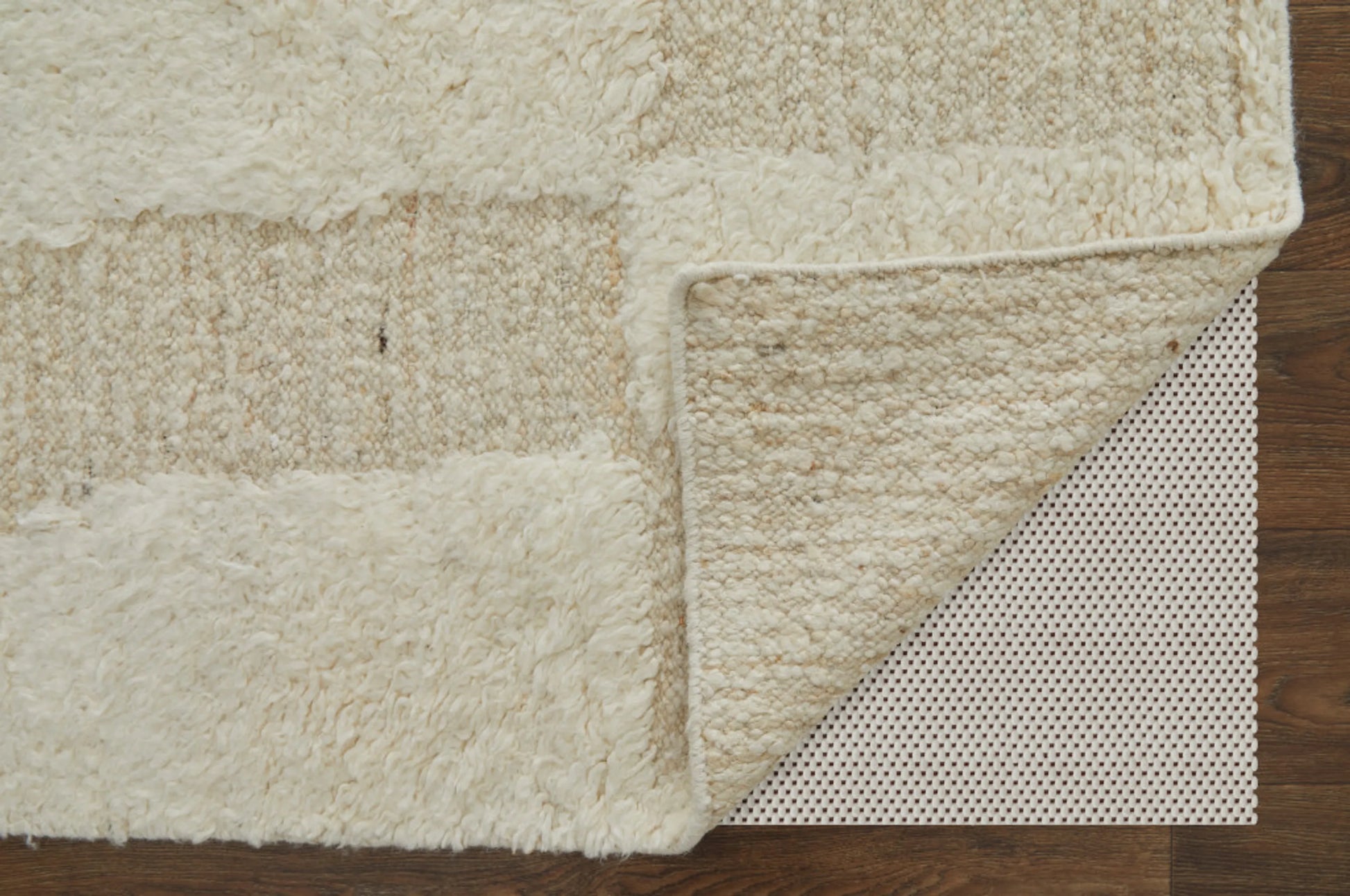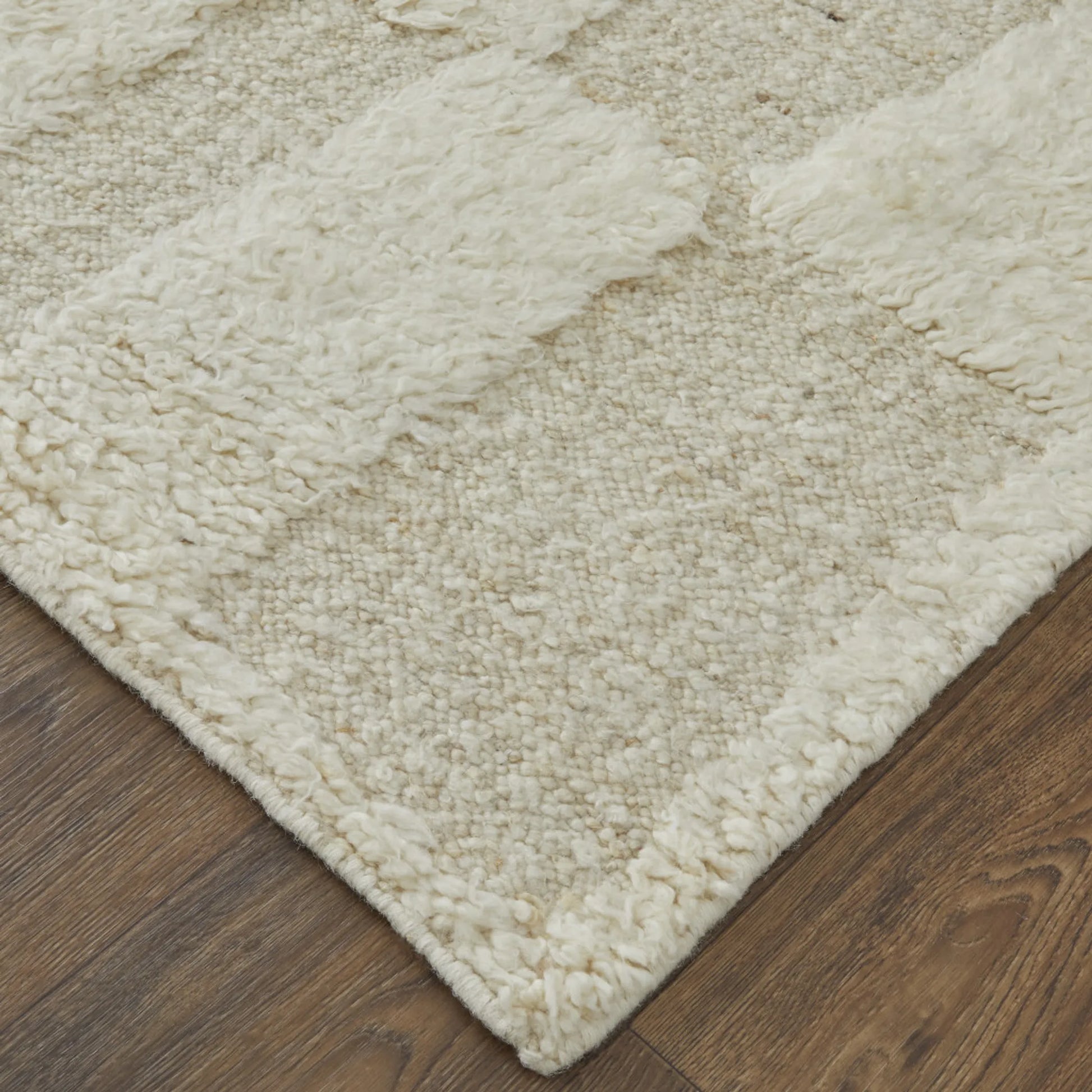 This distinctive area rug is expertly hand-tufted by artisans in India, using premium sustainable wool. Each rug is a one-of-a-kind piece of artwork. This unique rug features a bold, lusciously textured geometric pattern in elegant ivory. It is visually stunning and luxuriously plush underfoot.